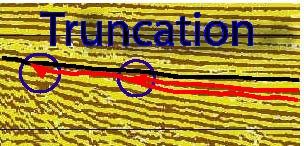 Termination of strata or seismic reflections interpreted as strata along an unconformity surface due to post-depositional erosional or structural effects.