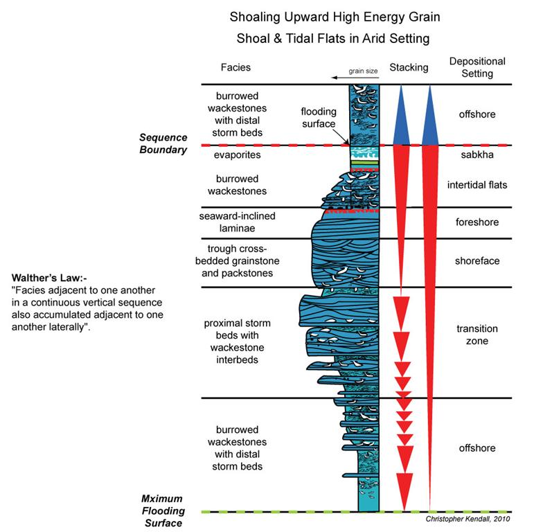 The vertical section a carbonate beach sediment expresses Walther's Law ("Facies adjacent to one another in a continuous vertical sequence also accumulated adjacent to one another laterally"). This association is used in conjunction with stacking patterns of sediments and their associated sedimentary structures to interpret and so determine the depositional setting of the these clastic sediments. Similar associations are associated with clastics.