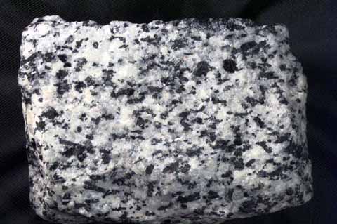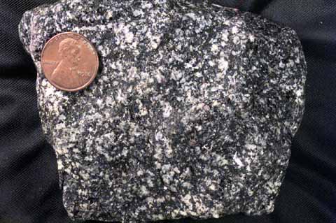 An intermediate igneous rock from the middle of Bowen's Reaction Series. Typically intermediate colored with a subequal mixture of light colored Sodium Plagioclase and dark colored Amphibole (although Biotite may also be present). Appearance is often descri bed as "salt and pepper" because of the mix. The mafic/plagioclase mix can vary widely, however. This specimen is low on the mafic side, but the next specimenruns high.