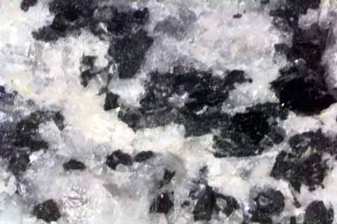 In this detail we see the mixed Amphibole and translucent, white Sodium Plagioclase. Some quartz is present (clear, glassy, grayish - as near the top center of the photo) but it is only about 5%. Note that the plagioclase and amphibole are near 50/50, with plagioclase being more abundant. It is this near mix that puts the rock in the diorite range.