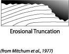 This is represented by termination of strata against an overlying erosional surface. Often toplap terminates beneath erosional truncation. Here the truncation is more extreme than toplap, and implies either the development of erosional relief or the development of an angular unconformity (Emery, 1996).