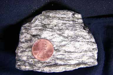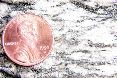 In this closeup the separation of the dark and light layers is not as clear as it appears in the larger image. Still, clearly the light colored zones are largely uncontaminated with dark minerals, which is characteristic of gneiss.