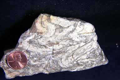 Banded Foliation composed of layers/zones of light colored quartz, feldspar interlayered with layers/zones of dark colored biotite and amphibole. The minerals bands in this specimen are well developed, although the folding in the rock may reduce some of the clarity of that.