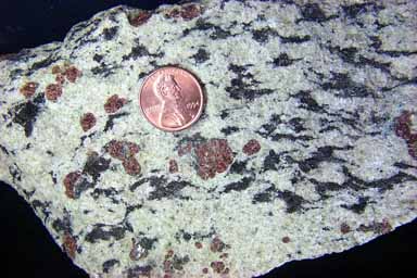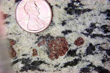 In this detail the dark and light colored minerals are distinctly separated, and the large garnet masses are also well segretated from the other minerals.