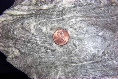 In this closeup the tight folds can be easily seen. There is a (missing) fold coming in from the top right above the specimen, and then within the rock folding back to the left.