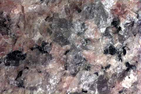 In this detail the pinkish colored orthoclase stands out clearly, but quartz is also common (clear, glassy, no cleavage; for example the grain on the bo