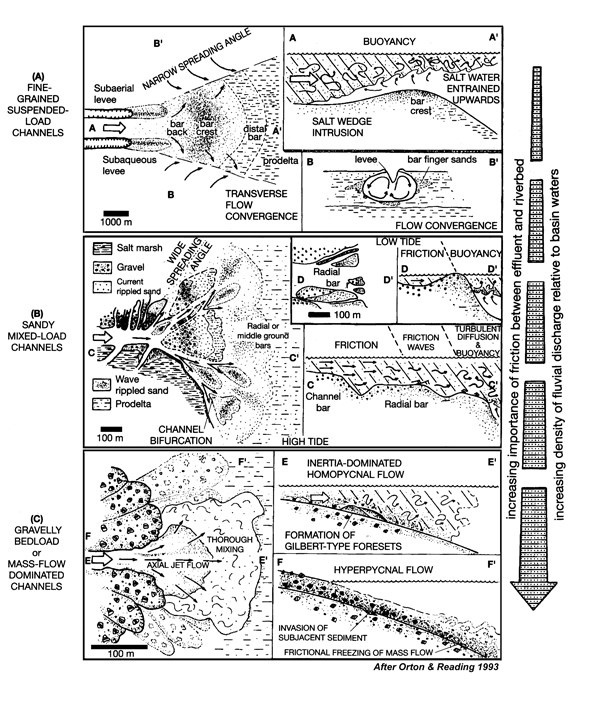 In the upper portion "A" of the figure Orton & Reading (1993) show how hypopycnal flow of suspended sediment can be detached from the Bedload and extend some distance seaward, buoyantly entrained in the sea water as are fine grained sediments associated with the Mississippi delta. In contrast mixed load channels like those of the middle portion "B" of the above figure produce a friction dominated river mouths with bifurcating channels. Finally gravelly Bedload or mass-flow dominated channels of the lower portion "C" of the above figure produce an inertia dominated river mouth with a propensity for over steepening of the basin margin and the development of mass flows.