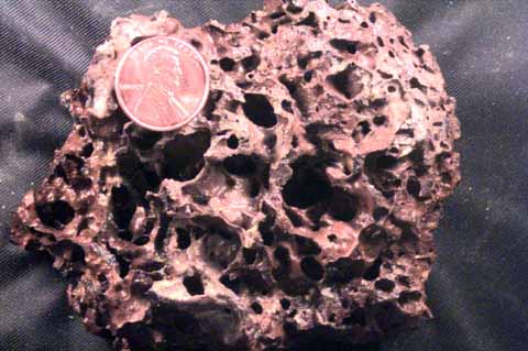 There is no scale in this picture, but the view is about 2 inches across. The very fine vesicles (holes) can be seen even here. The rock is quite light in weight since it is mostly made of holes. The next specimen has much larger vesicles in it.