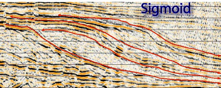 A prograding clinoform pattern formed by a number of superposed sigmoid (s-shaped) reflections interpreted as strata with thin, gently dipping upper and lower segments, and thicker, more steeply dipping middle segments. The upper (topset) segments of the strata approach horizontality or have very low angles or dip, and are concordant with the upper surface of the facies unit (Mitchum, AAPG Memoir 26).