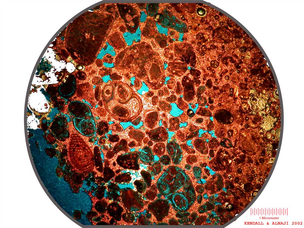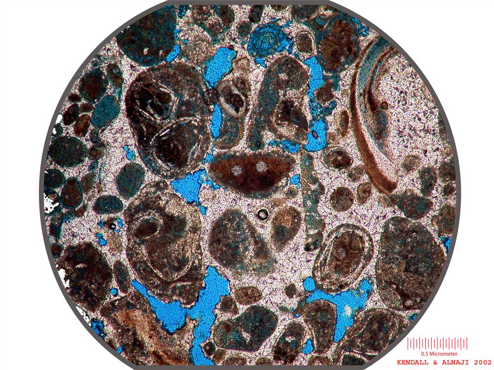 Striking high energy concentric aragonite ooid grains and bioclasts that accumulated on the NW margin of the New Providence Pleistocene high energy shoals. Note the voids within the cortex of ooids that are the product of dissolution related to the influx of freshwater during the uplift and subaerial exposureof these shoals in the Holocene.