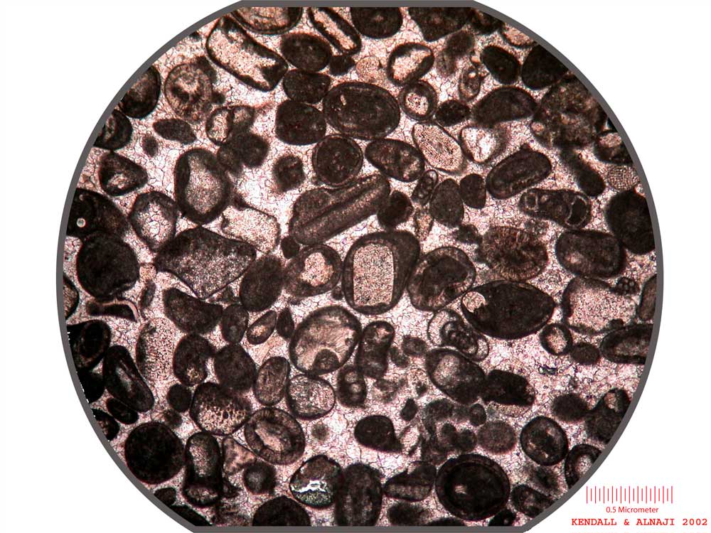The isopachus rim cements are related to inital freshwater cements dissolved from original aragonite and calcite. The radial calcite ooids accumulated adjacent to the tidal channel seen in outcrop on Rt 64 close to Carter Caves in Kentucky. Note ooid nulceae of crinoid ossicles and echinoid spines. There appear to be a few botryoidal grains enclosed by radial ooid coating. Darkened spots within bioclastic layers are cyanobacteria colonies that cause local micritization. Some grains may have been bored by sponges.