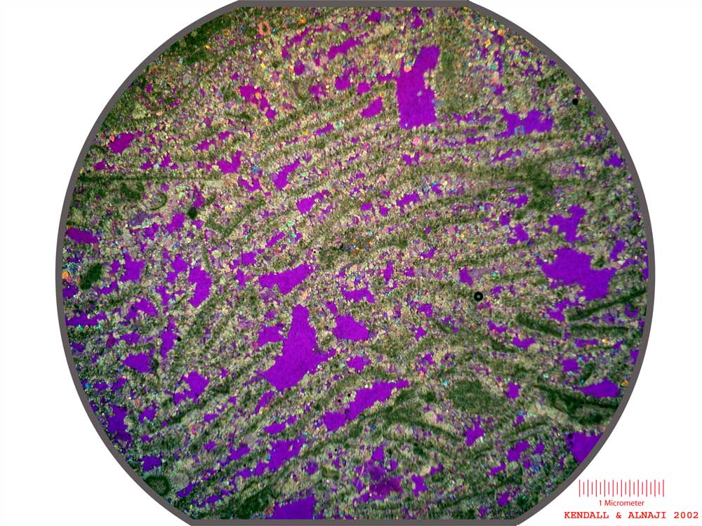 A collection of abundant algal plates who's internal pores are still visible. The algal plates are heaped upon each other and are enclosed by thin bladed crusts. Most of the final porosity is filled by equant spar, though there is some porosity that remains unfilled. From the J Harlan Johnson Collection.