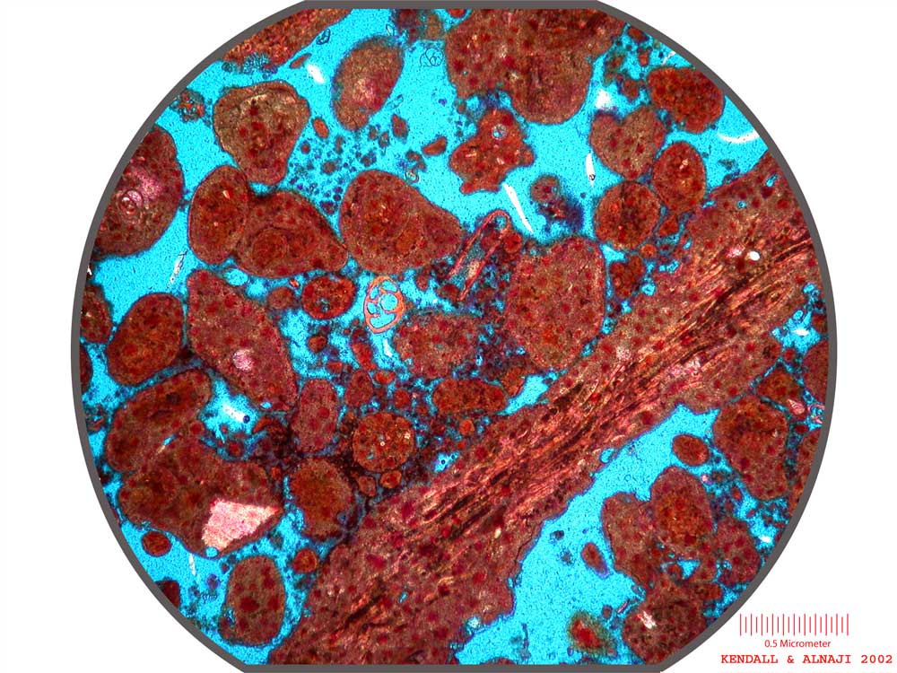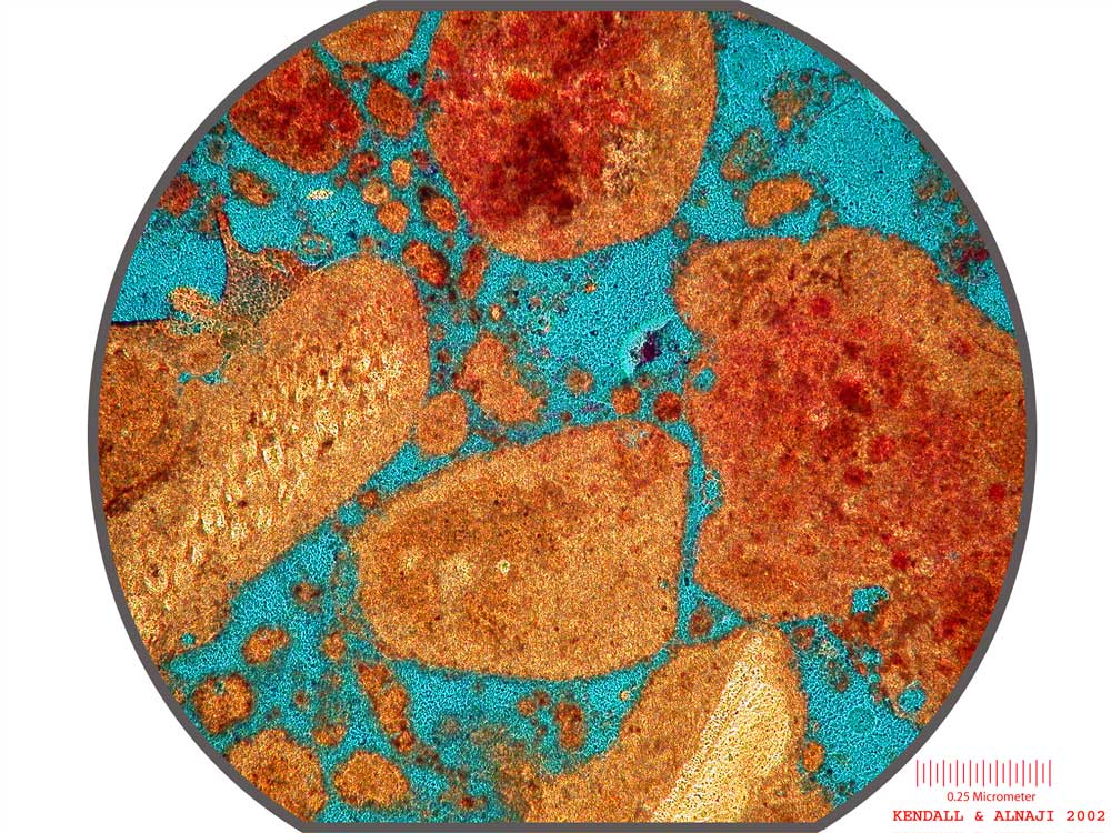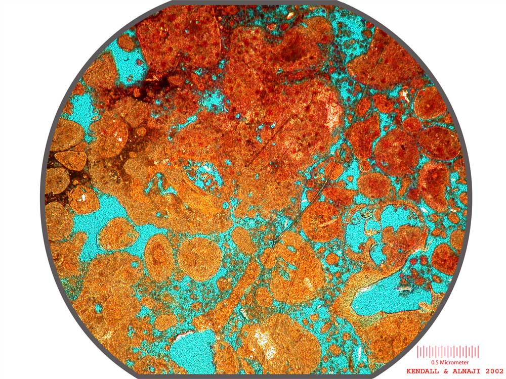 Striking marine cementation and replacement of grains by micrite. Empty pore spaces between grains are now filled by blue stained epoxy.