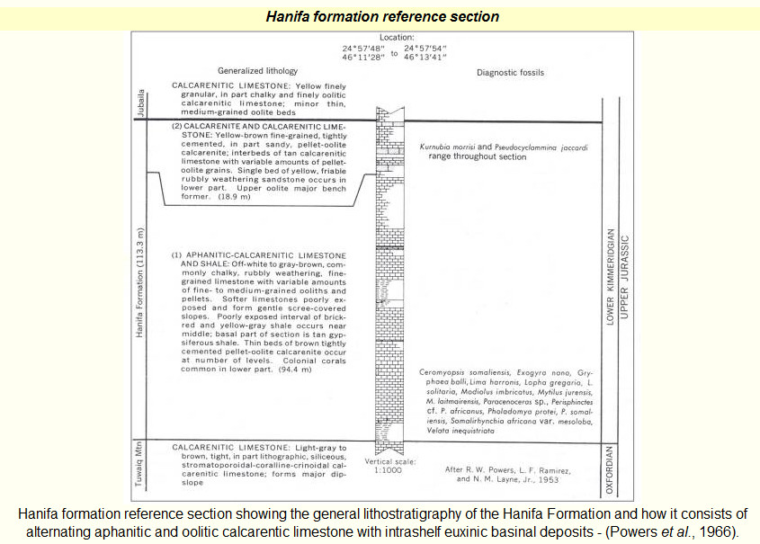 The Hanifa formation derives its name from the Wadi Hanifa, 60 km SW of Riyadh where the type section was originally measured by Steineke in 1937 (Powers et al., 1966). The lithology of the Hanifa Formation has been discussed briefly in the Hanifa Tectonics section. A greater emphasis is now placed on the sequence stratigraphic framework from the perspective of sea level, paleo geography; and high frequency cycles (.01 - .1 million years).