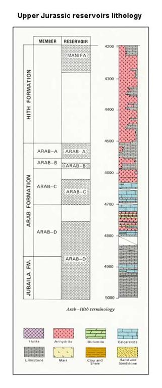 The Upper Jurassic reservoirs consist mainly of limestone. Most of the reservoirs are formed of carbonates with keep-up sheet-like geometry deposited during a steady rise in sea level of the transgressive systems tract in the early Upper Jurassic. These reservoirs became increasingly regressive and contain shallower facies toward the top of the Jurassic and were culminated by the deposition of the regional Hith evaporite seal. Following is a brief description of the reservoir units starting with the Tuwaiq Mountain and ending with the Hith Formation.