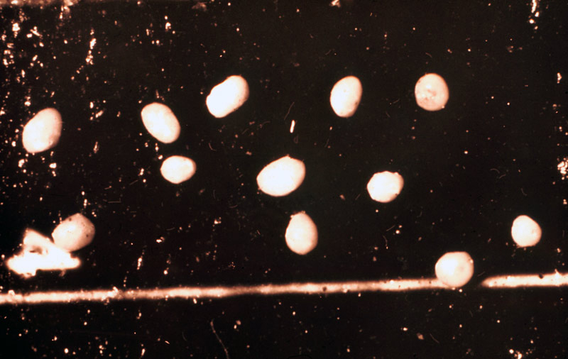 If foraminifera are treated with 40 percent hydrofluoric acid for more than 10 minutes, all the calcium carbonate is replaced, molecule by molecule, by transparent calcium fluoride (Grayson, 1956). The mucilage envelope and algae resist solution (Fischer, 1897) and consequently stand out as translucent and green in altered areas. Treatment with 40 percent hydrofluoric acid for 5 minutes makes the surfaces of the foraminifera transparent and reveals the network of radiating filaments and globular algae. Fresh foraminifera become completely transparent. The best optical results with the calcium fluoride specimens are obtained by viewing them under water.