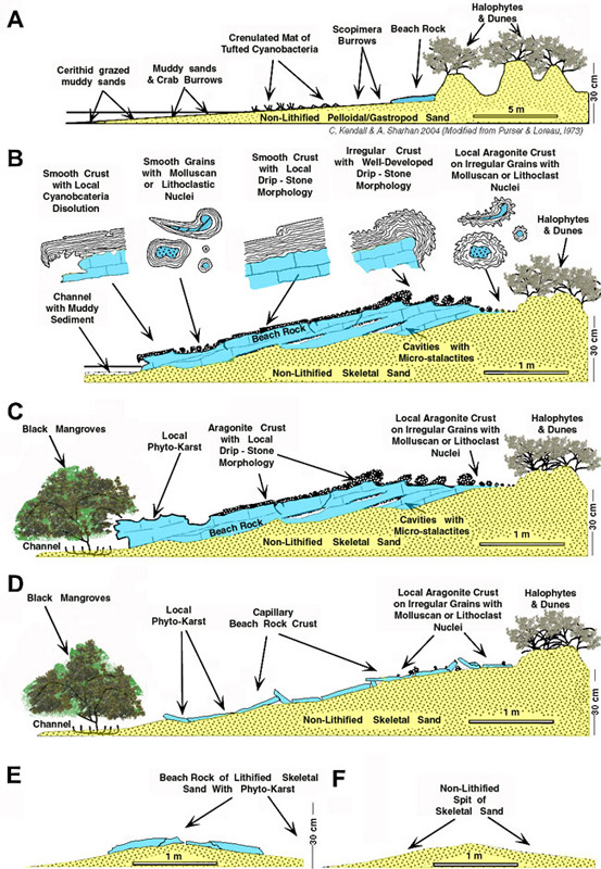 Many of the more enclosed spits have their shoreward eastern facing margins covered by aragonitic marine cement that forms coatings not only on the beach rocks that are forming here but on cerithid gastropod shells washed over recurved coastal spits by southward longshore transport and local westerly storms. Marine carbonate cement crusts (up to 3 cm in thickness) are present and best developed to the lee of these sand spits. Uncoated cerithid shells occur seaward of the easternmost spit. This is a low energy region where shells are cemented into beachrock (Purser and Loreau, 1973).