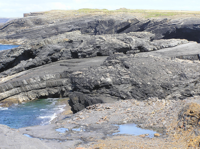 North of the Shannon Estuary the Upper Ross Formation outcrops in cliffs of Namurian sediments along Atlantic shore at Fisherman's Point. At this locality deepwater fan lobes are channeled into one another and overlie the slumped horizons. The sheets of sand forming the fan lobes are characterized by incised stacked channels. The sandstone fill of the channels sometimes extends beyond the channels as wings (Elliot, 2000).