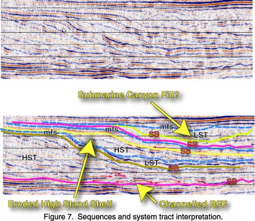 The well data and the seismic data suggests that the Nanushuk Group accumulated in shallow deltaic and fluvial settings, while the Torok Formation collected in delta slope and basin floor fan settings. Individual sequences are interpreted to contain evidence of slumping, basin floor fans, slope fans, and onlapping high stand wedges (Figure 07), and the exercise will examine this. The clinoforms can be mapped and the exercise should confirm that they become younger to the north and east. The internal geometries of these clinoforms suggest an absence of small-scale tectonic control on the area. The exercises outlined below ask that this conclusion be confirmed.