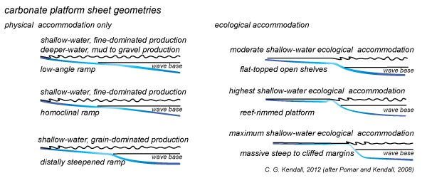 high-frequency heterogeneous depositional sequences that have a high ecological accommodation.(Pomar and Kendall 2008). These examples of physical accommodation for carrbonate systems, and in particular platform exhibit a diversity that is a result of a wide variety of carbonate production processes and mechanisms that cause their redistribution within the basin. Each different biotic system has a unique competence (ecological accommodation) for building above and below the hydrodynamic shelf equilibrium profile of Swift and Thorne (1991). Thus production depends on biological evolution including ecological requirements (substrate, competitive displacement, etc); the type, size and efficiency of the carbonate factory, which in turn, depends on the area available to thriving carbonate producing biota (basin floor physiography), on intrabasinal conditions (nutrients, temperature, water energy, water transparency, salinity, oxygen, Ca2+ and CO2 concentrations, Mg/Ca ratio, alkalinity, etc). Furthermore, sediment dispersal depends on the interaction between the physical characteristics of the different types of sediment being produced (grain size, bulk density as determined by porosity within the grain e.g. intraskeletal porosity, etc) and the hydraulic energy ambient to the production loci, and its modification by binding, trapping, baffling and framework building (Ginsburg and Lowenstam, 1958) as well as by early cementation processes.